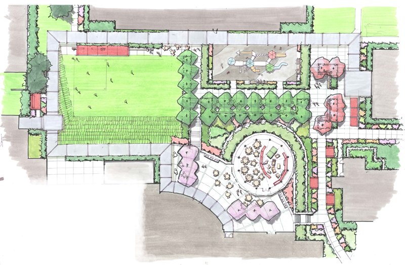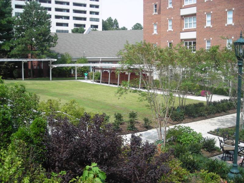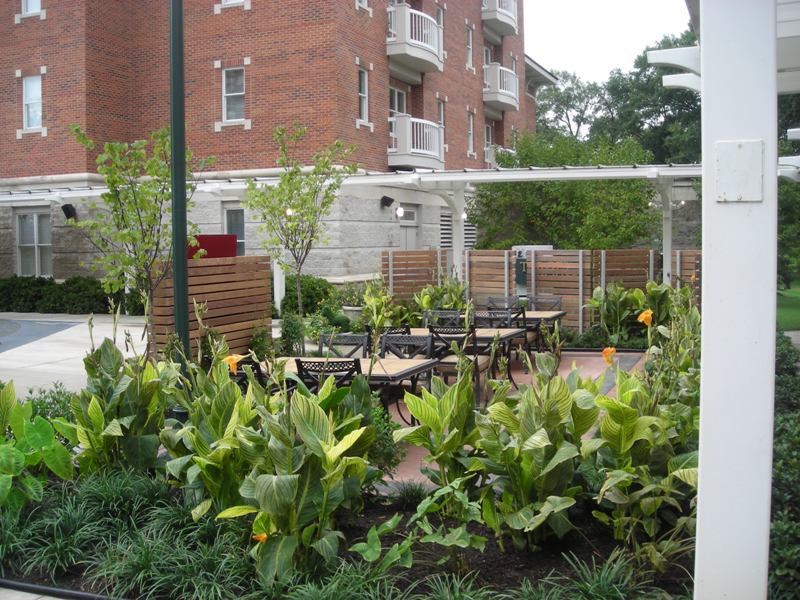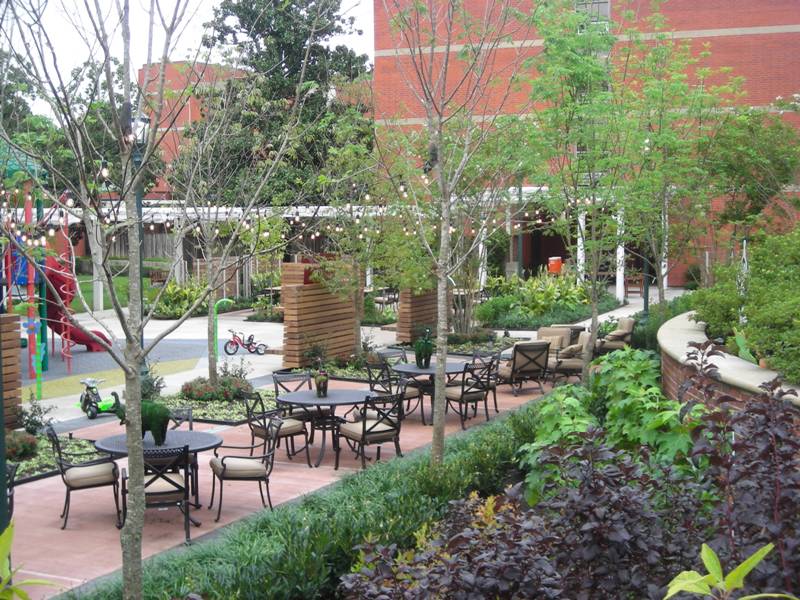 The shared courtyard between Target House I and II was in need of renovation to better serve the needs of the patients, their families and the residents of the adjoining nursing homes. Seating areas surrounded by lush plantings invite the residents to out to a comforting, natural, toxin free environment, a large lawn area allows open play and a gazebo was transformed into an outdoor teen area.
