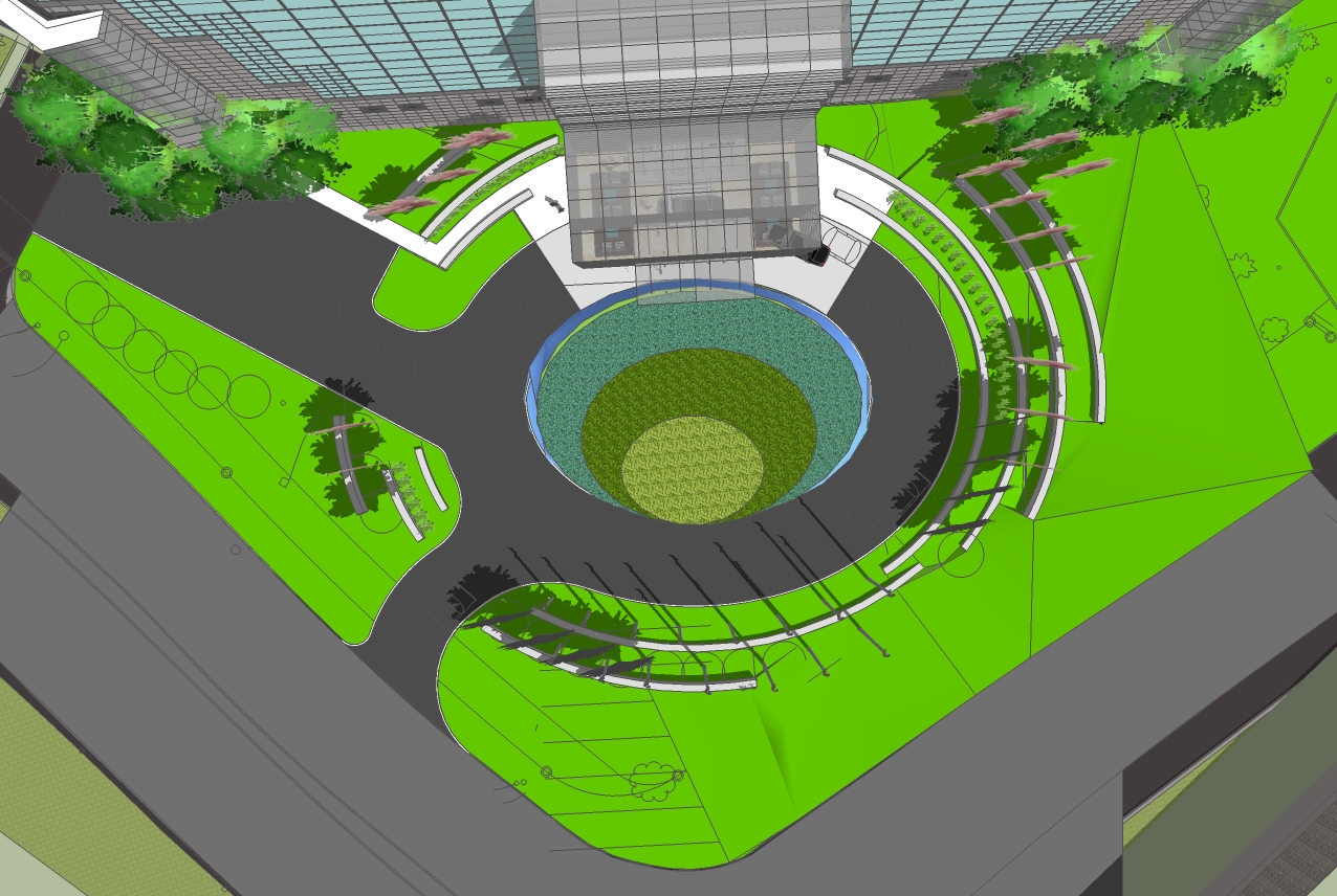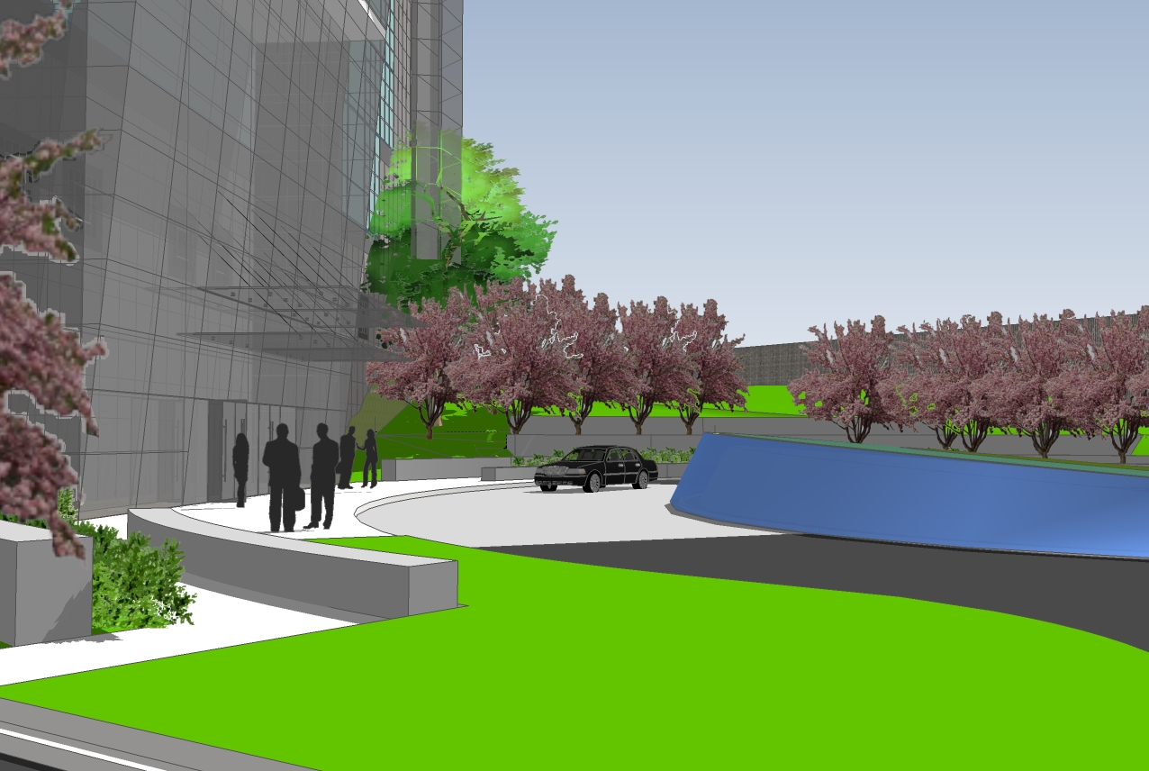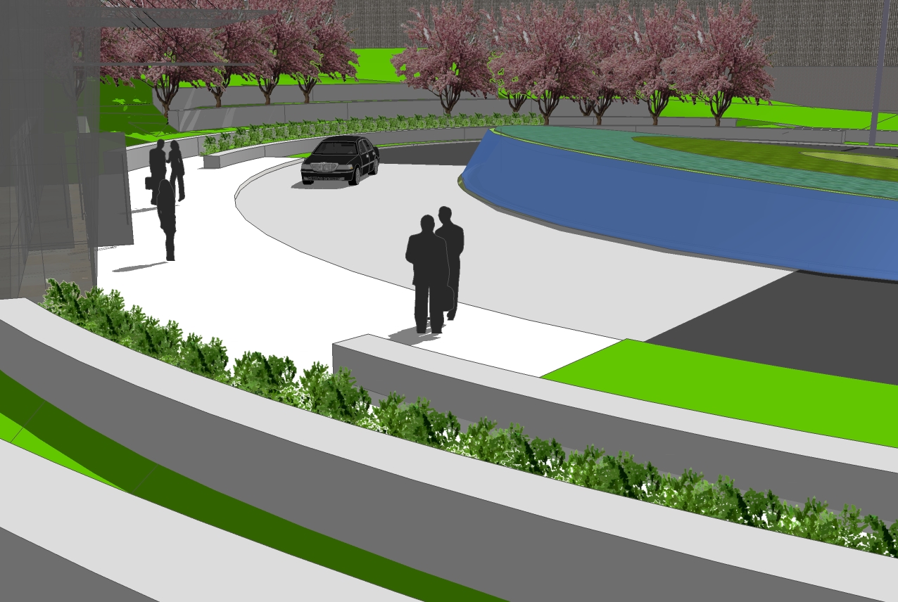 An elliptical drop off brings cars to a new canopied, building entry. The center of the ellipse is a sloping plane rising towards the entry. The slope blocks the unsightly views as users exit the building. On the sides of the slope is a rock faced waterfall.
