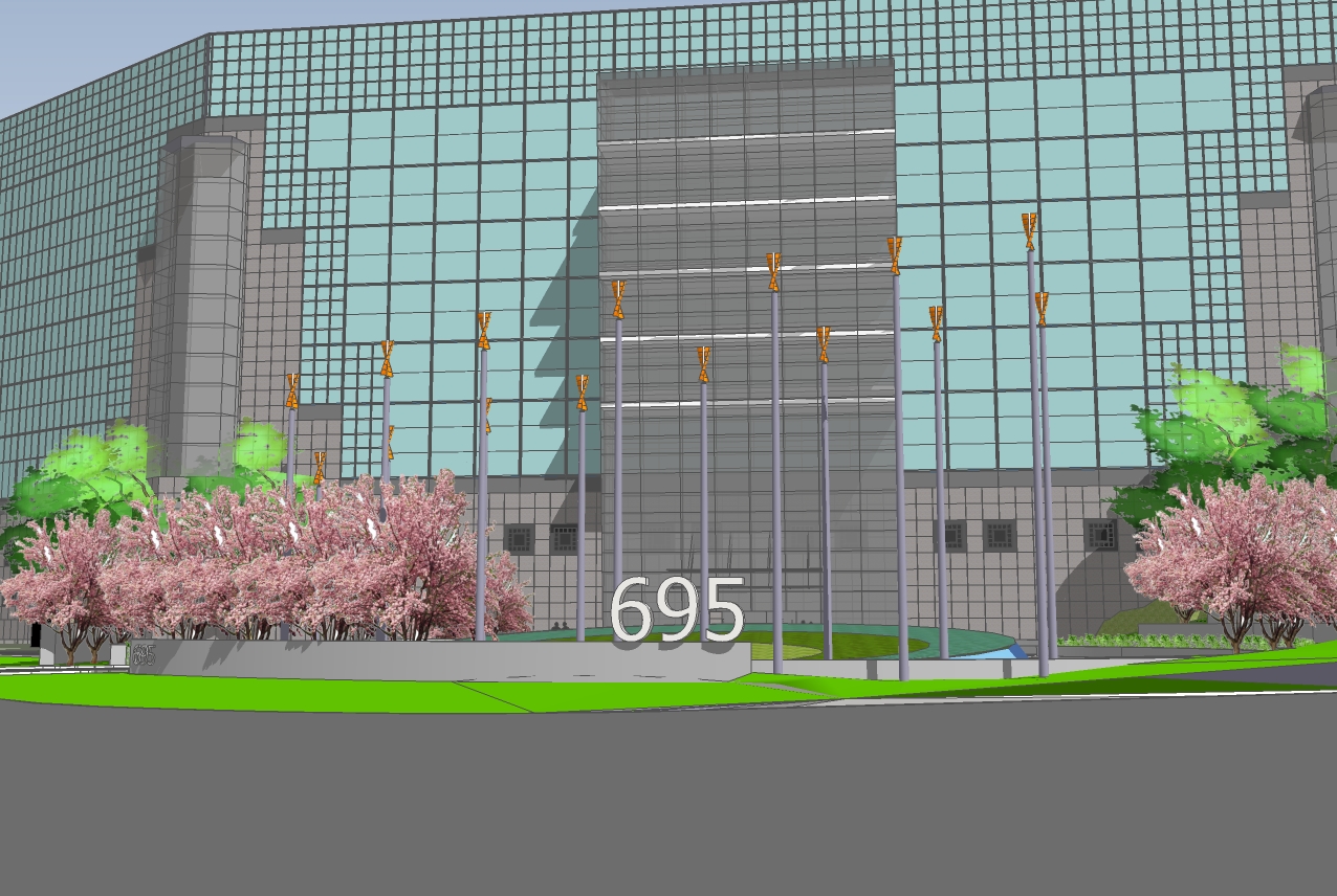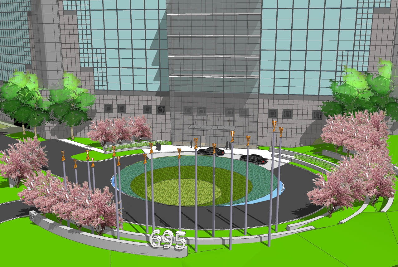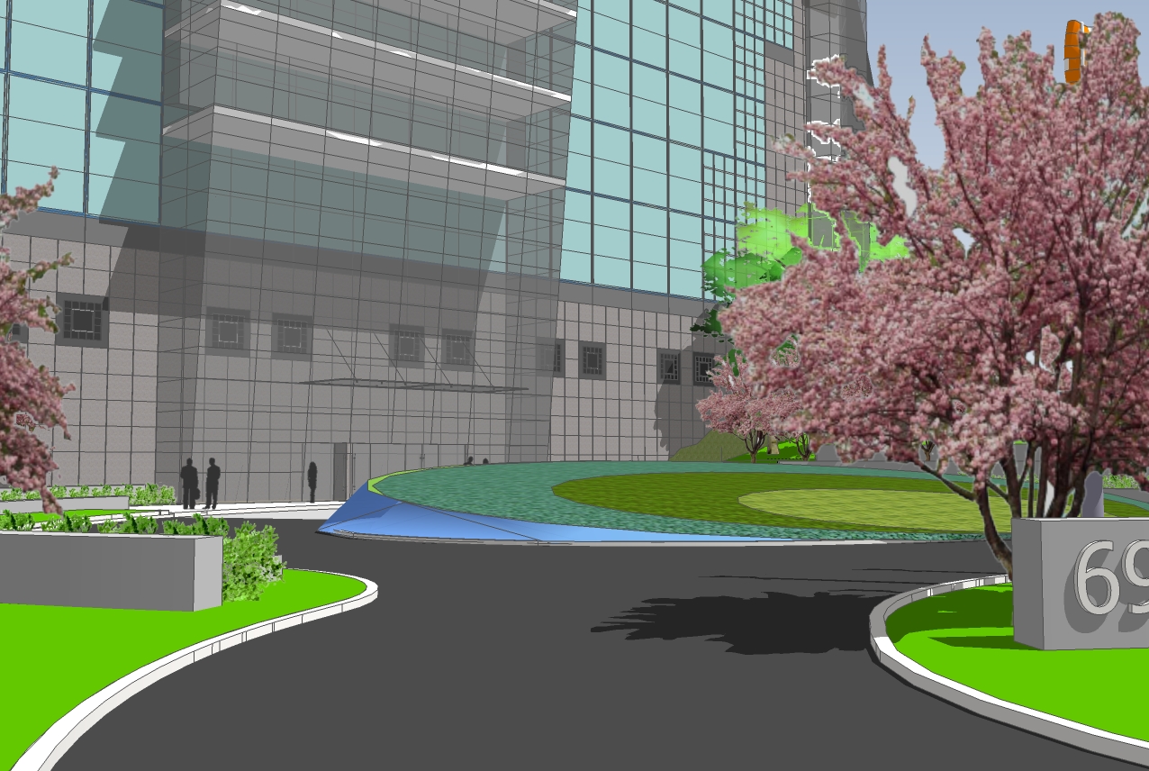An elliptical drop off brings cars to a new canopied, building entry. The center of the ellipse is a sloping plane rising towards the entry. The slope blocks the unsightly views as users exit the building. On the sides of the slope is a rock faced waterfall.